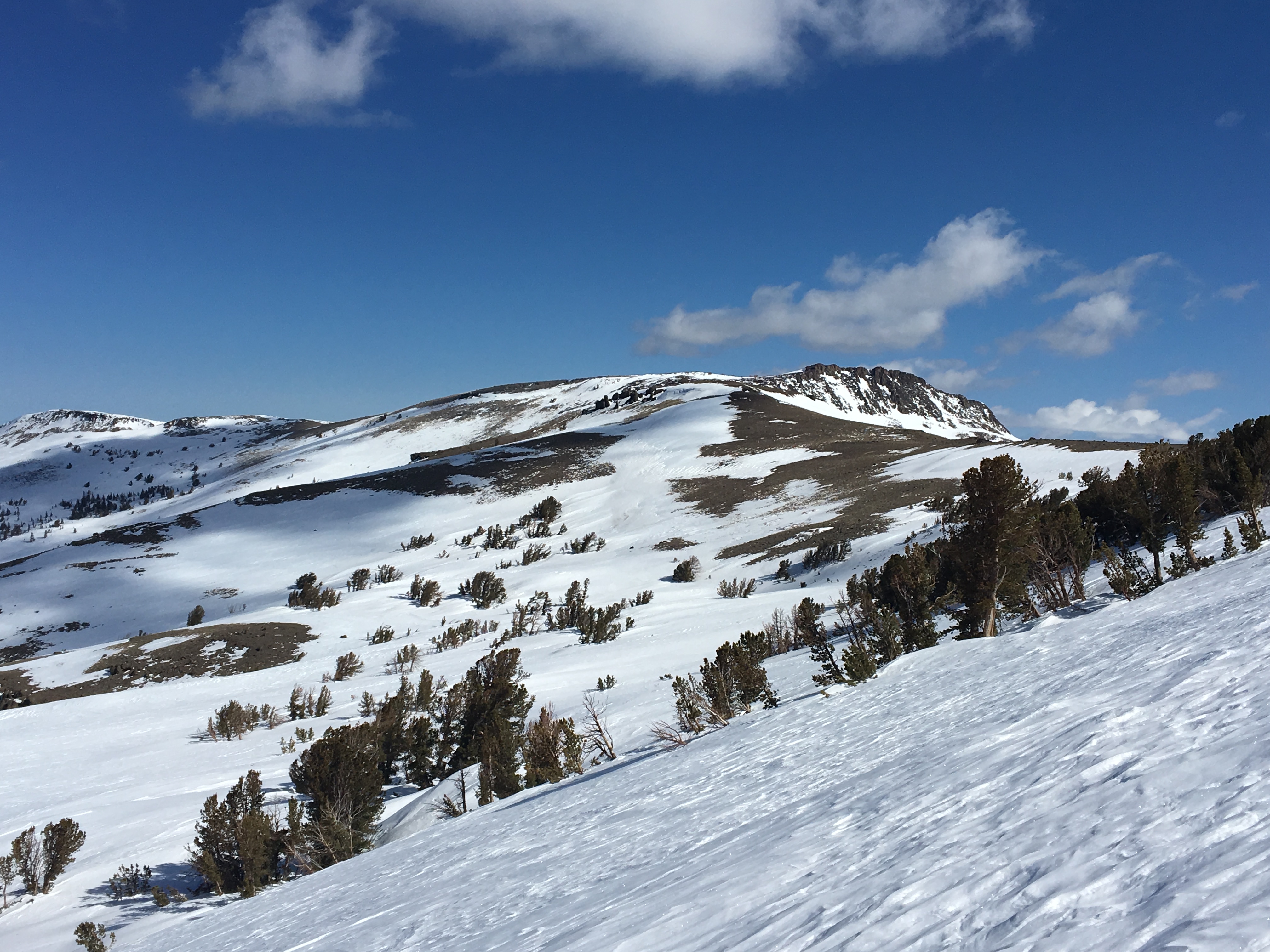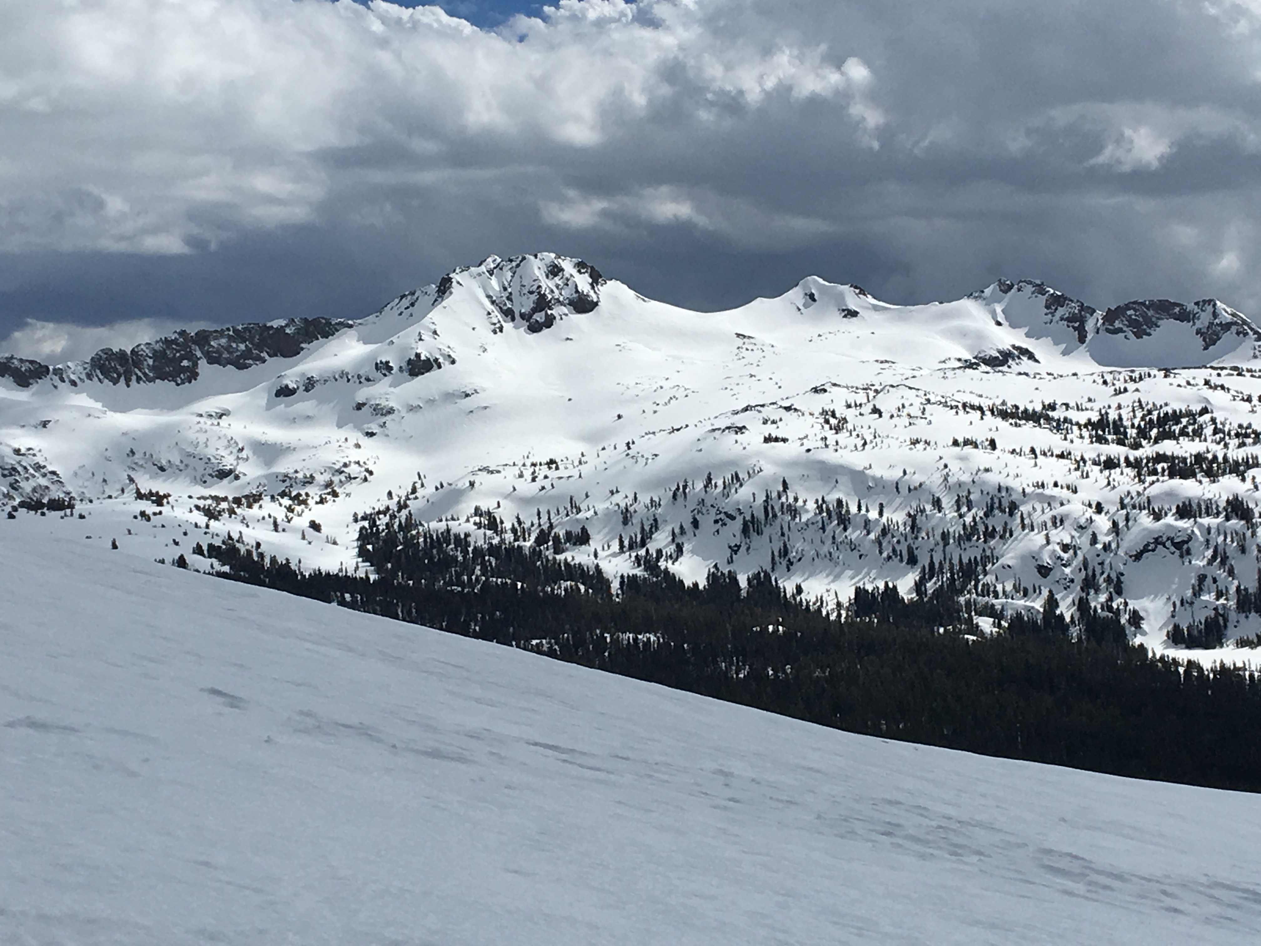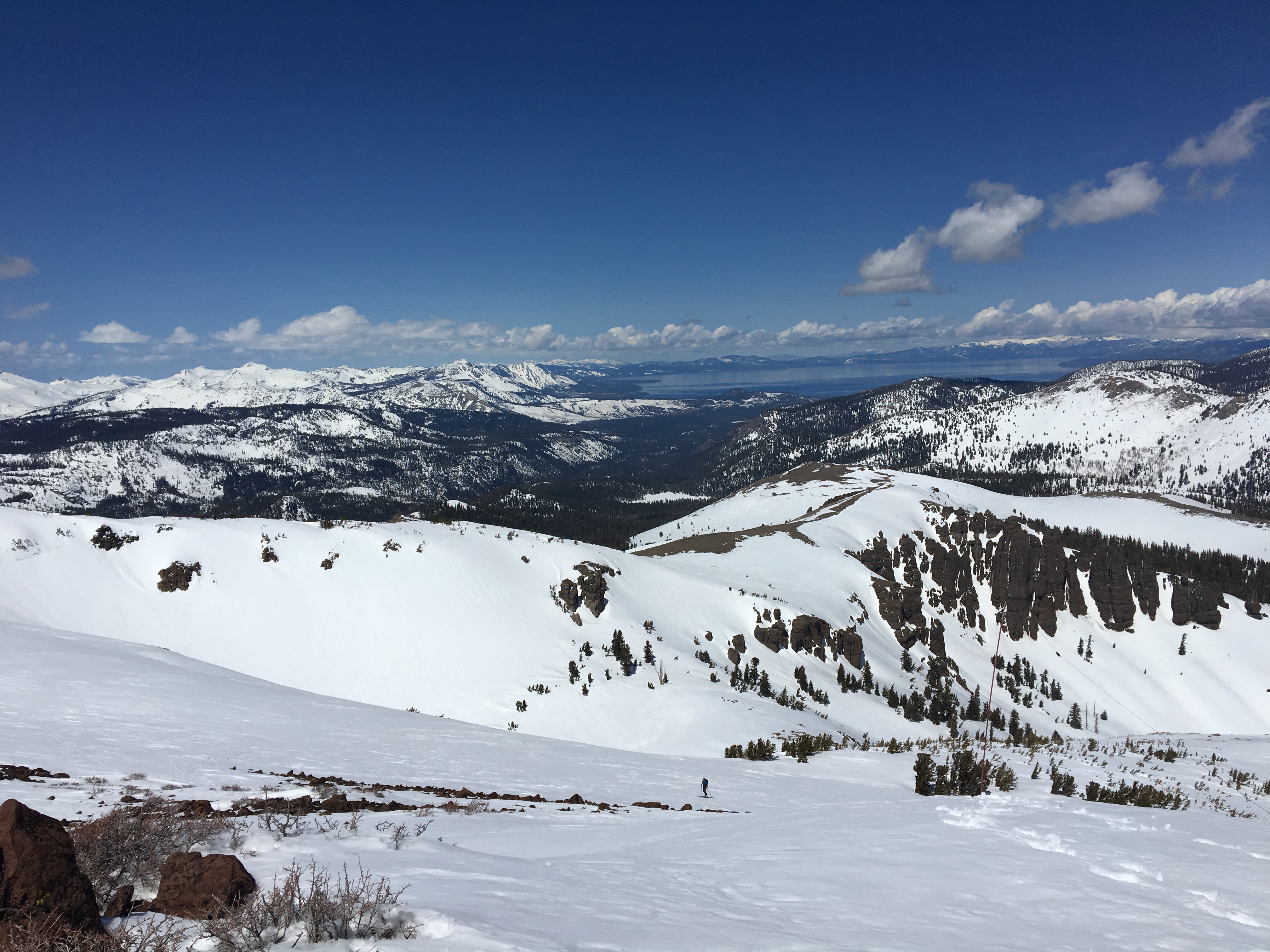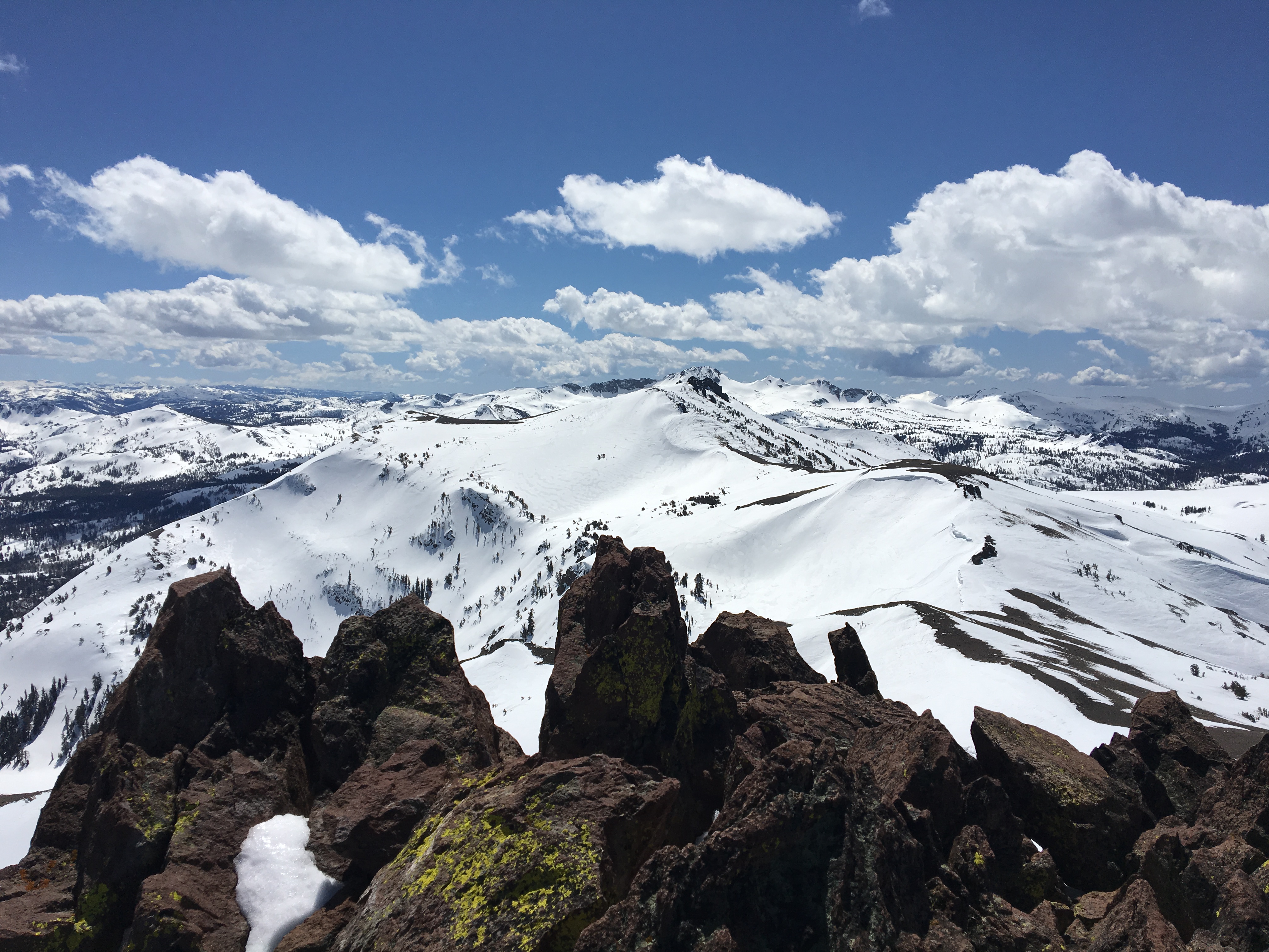 So Sunday the goal was get up to Stevens Peak (W6/NS-345).  This is one of the peaks on my “TRT Challenge to Self” so one checked off, a few more to go.  No this summit does not help me from a miles perspective.  There was still plenty of snow, so I opted to go up the backcountry skiers route, but the sun was blasting that hillside, so it was getting soft. Sidehilling in soft snow on a 30 degree slope is risky for a multitude of reasons, unless you have solid self arrest skills, do not bother. HOWEVER..you gain 1000 feet in the first mile, making for a mellow grade for that last 1/2 mile push up the summer trail. Even though there was ample snow in the first 2.5 miles the last mile was pretty snow free on the climb. The top still had plenty of snow though. People are pecuiliar, I followed these two skiers up the bowl, and watched em descend. Turns out one of the guys was on his third day out ever, not third day of learning BC Skiing, but third day of skiing period. 30 degree slopes are hard blues/easy blacks. Is BC on a spring corn day on avalanche terrain really the place to be learning how to ski? Saw a couple of snow bunnies and a few bear prints in the snow while hiking. All in all, I love snowshoeing thru the snow. Once on the summit, I saw my fair share of BC skiers/snowboards who had come up the main face of Stevens (as opposed to Carson Pass). Oddly enough there were two backcountry riders who ferried one of those super expensive drones that have “follow the subject mode’ or whatever it’s called. The guy was complaining that my antenna was creating interference. Odd that the drones are impacted by the RF from a radio on 20m. I was nice and let them film and ski out, b/c the sooner they were gone the sooner I could get to it. So the nice thing about my SOTA attempts is they are always a learning experience. The experience on this trip is that snow does affect radiation patterns and such, oh and I need to figure out how to use APRS2SOTA. I somehow managed a contact on 20m at ~60miles crow fly. Thanks KK6CUG for the spot, that brought the chasers on. That and since I could see Kirkwood Ski resort, I managed a few simplex contacts from folks with their HT’s riding the lifts. Funny, I never considered carrying my HT while resort riding, but if you snag ski patrol’s frequency, I can see why it’s worth it. The hike out was pretty uneventful, but I went back the summer/PCT path instead of trudging down that hillside I came up. It would be easy to snag Stevens and Red Lake in a single day, and I almost considered it, if I had been off Stevens 30 minutes earlier I probably would have gone for it. Anyway some pics from the summit and from the surrounding areas. Oh how I do love the Tahoe/Carson area!  My particular path was 7.1 miles total, the return path was a bit longer then the up path, but I was going for the safety factor, and even did some butt glissading.  I was also scouting the route for my attempt on Red Lake peak, I’ll be skipping the skiers bowl that overlooks HWY 88 the next time