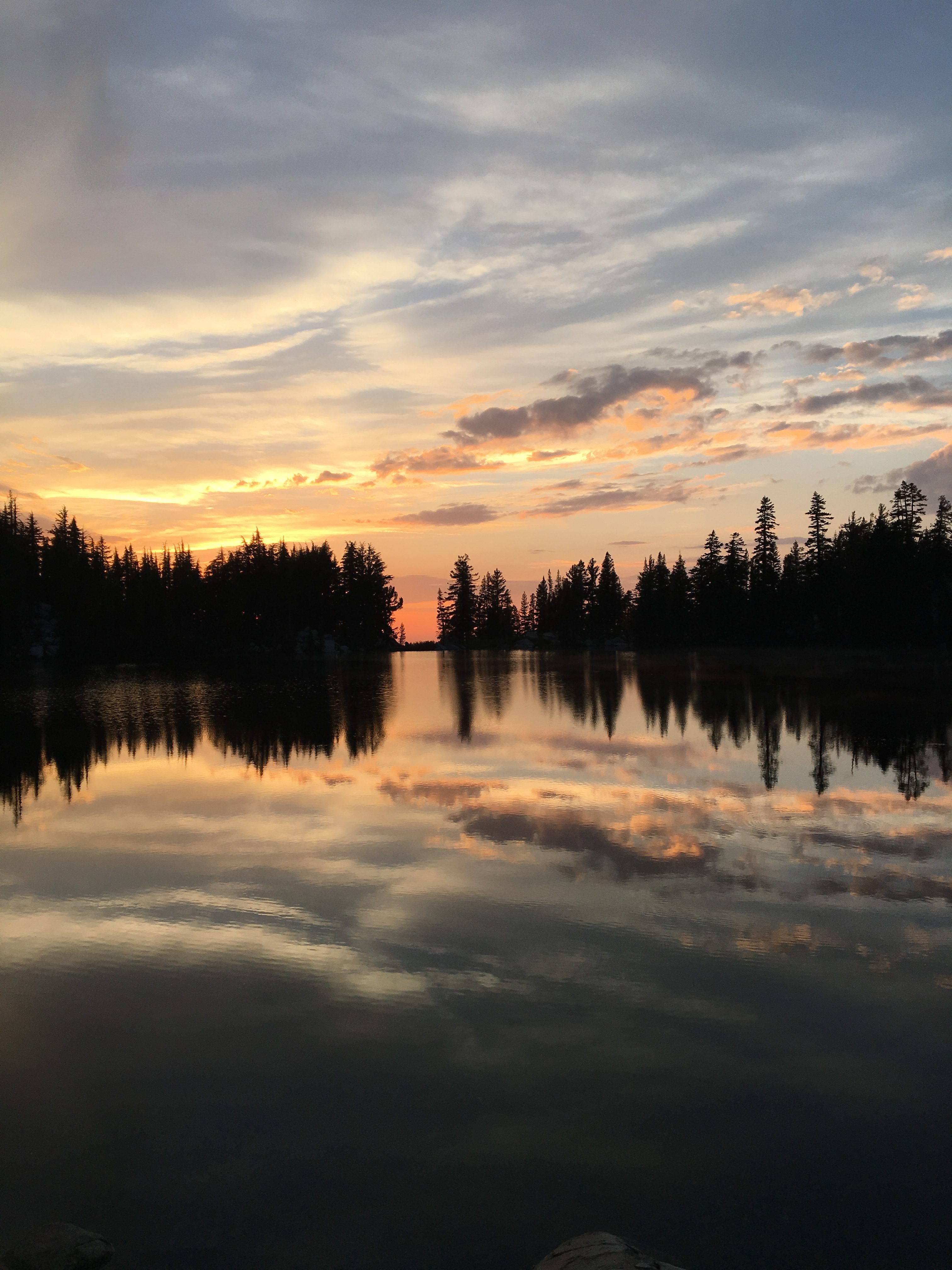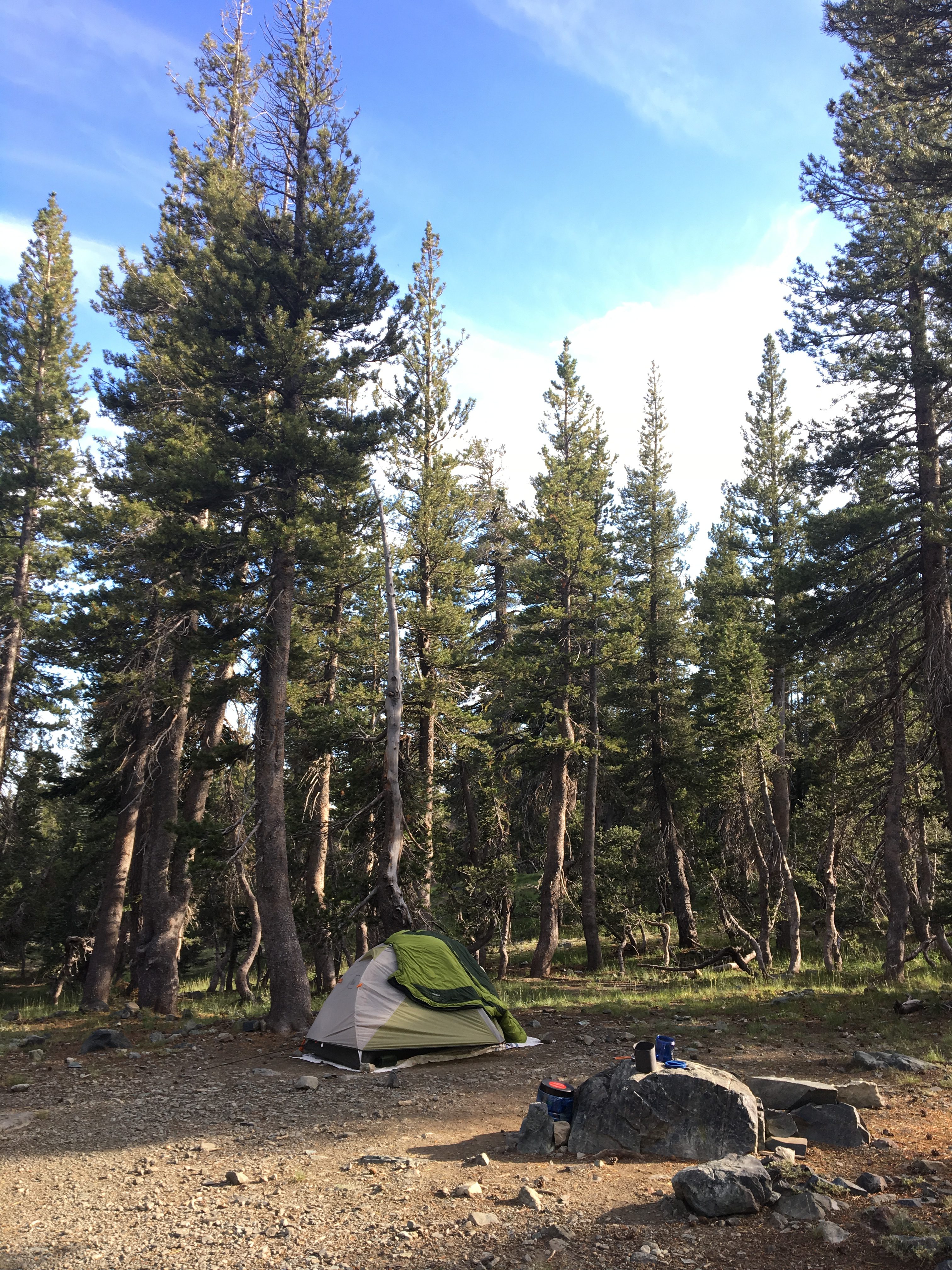 Once done with the activation, I started down heading towards Stony Ridge Lake. I could see that my best bet was to cross over where I crossed this morning, so “lets contour, and not go down too fast”. I wound up in a HUGE boulder field that was the equivalent to a class 4, and possible class 5 down climb in a few spots but I found some clean water sources to drink from while in the boulder fields. Had to fight a few willow stands, those slowed me down, and made me tired. All told the 8 mile round trip took about 7 hours “tent flap to tent flap”. Lesson learned, but Lola was happy to see me when I got back. I should also note that it’s peak wildfire season despite the water and the super wet winter, Tahoe had quite a few fires burning around the area, including one down by Yosemite. Needless to say, that combined with a low in the area was making for some fun evening weather in the area. To date I had not had rain on this trip, but I managed to get back to camp just as a storm was hitting us.
