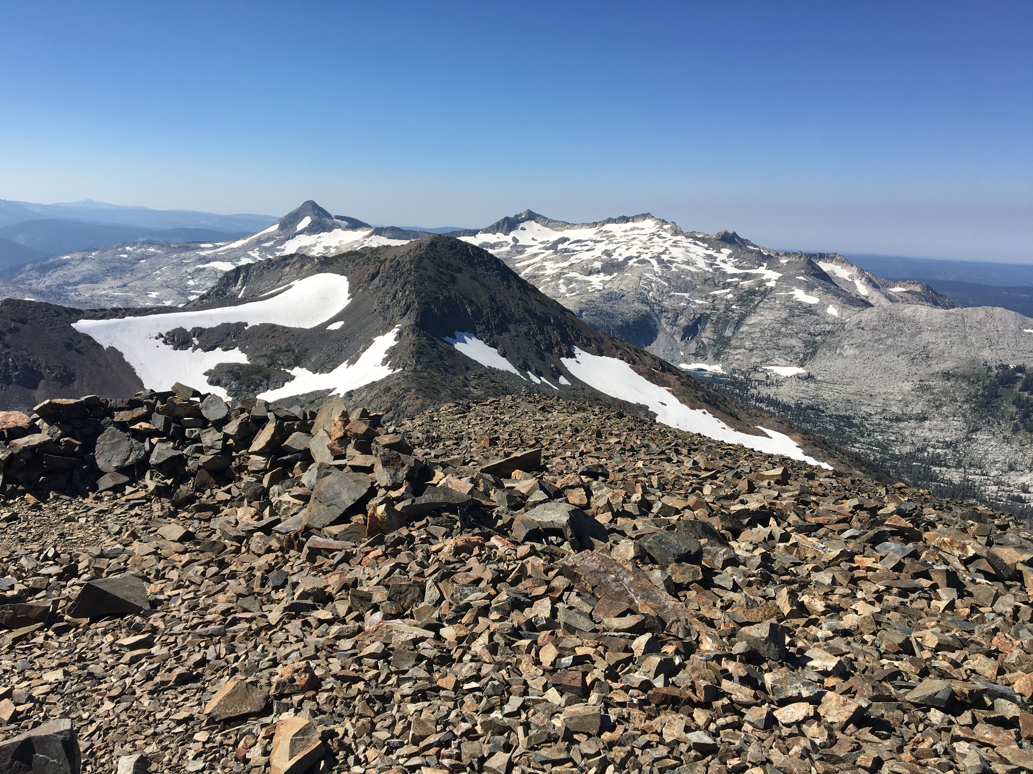 the last switchback before hitting Dick’s Pass, you turn off trail and start heading along the saddle there to climb the last 1600 feet. Oh btw, there is no trail. I made the summit in a couple of hours, even with the fun climb and started setting up. While looking for the logbook/ammo can on the summit, I found a note that was buried under some rocks. Someone had written a touching letter to someone in their life that had passed away. Out of respect I left it up there, and did not take a picture of it. I forgot to bring my crappie pole mast, so decided to just run my antenna about 2-3 feet off the deck between some rocks, and running off at an angle to get a south and east/west reflection. Oddly enough I managed to get an S2S with a guy up in Washington so something was reflecting me that way too. I scored 6 QSO’s and was starting to think I could manage Tallac too if I got a move on now. The down climb took me about the same amount of time, and it is a pretty well established goat trail, but it is exposed in some spots, so if you are not comfortable in a free scramble situation, I would advise you to take caution.