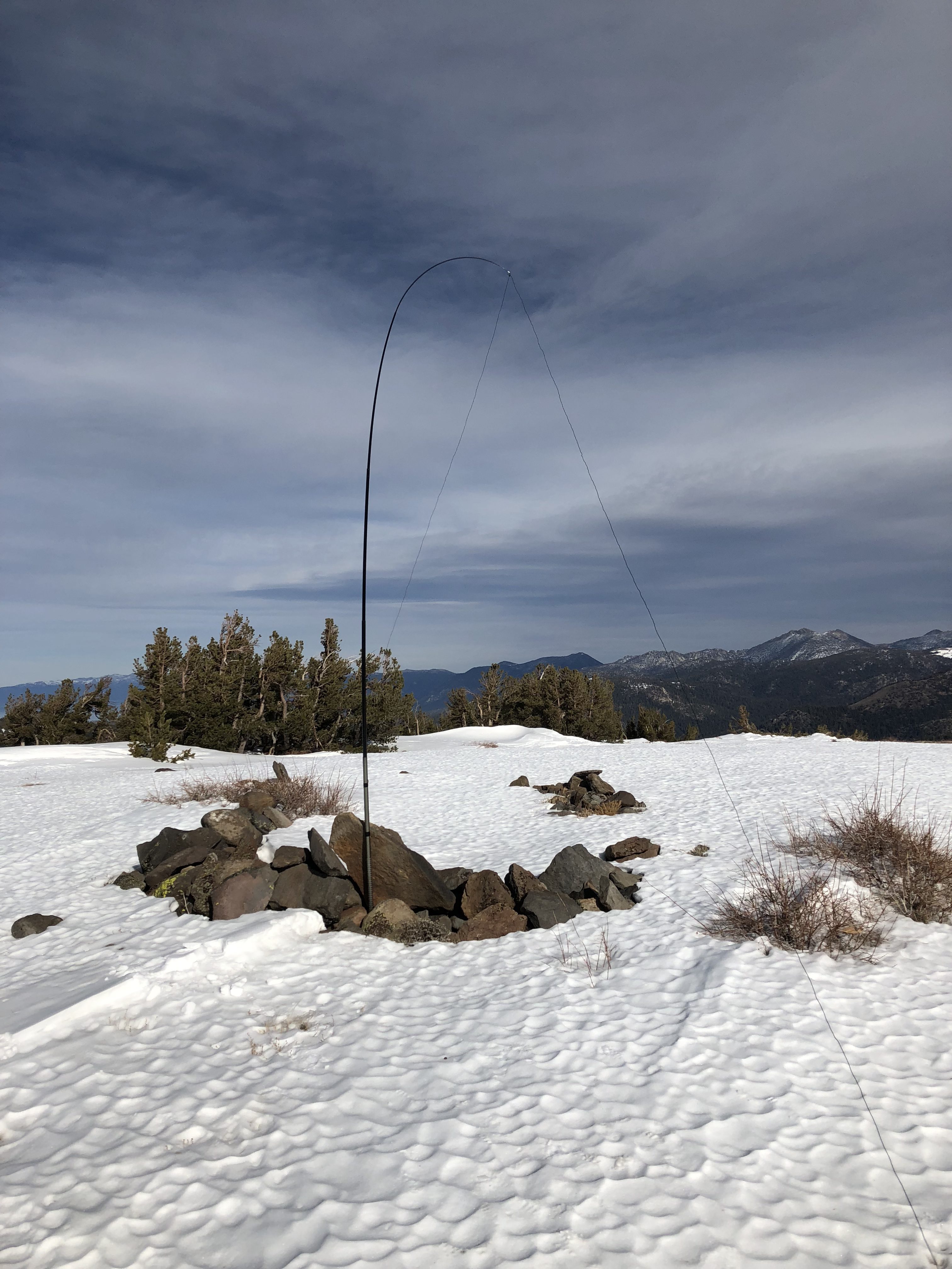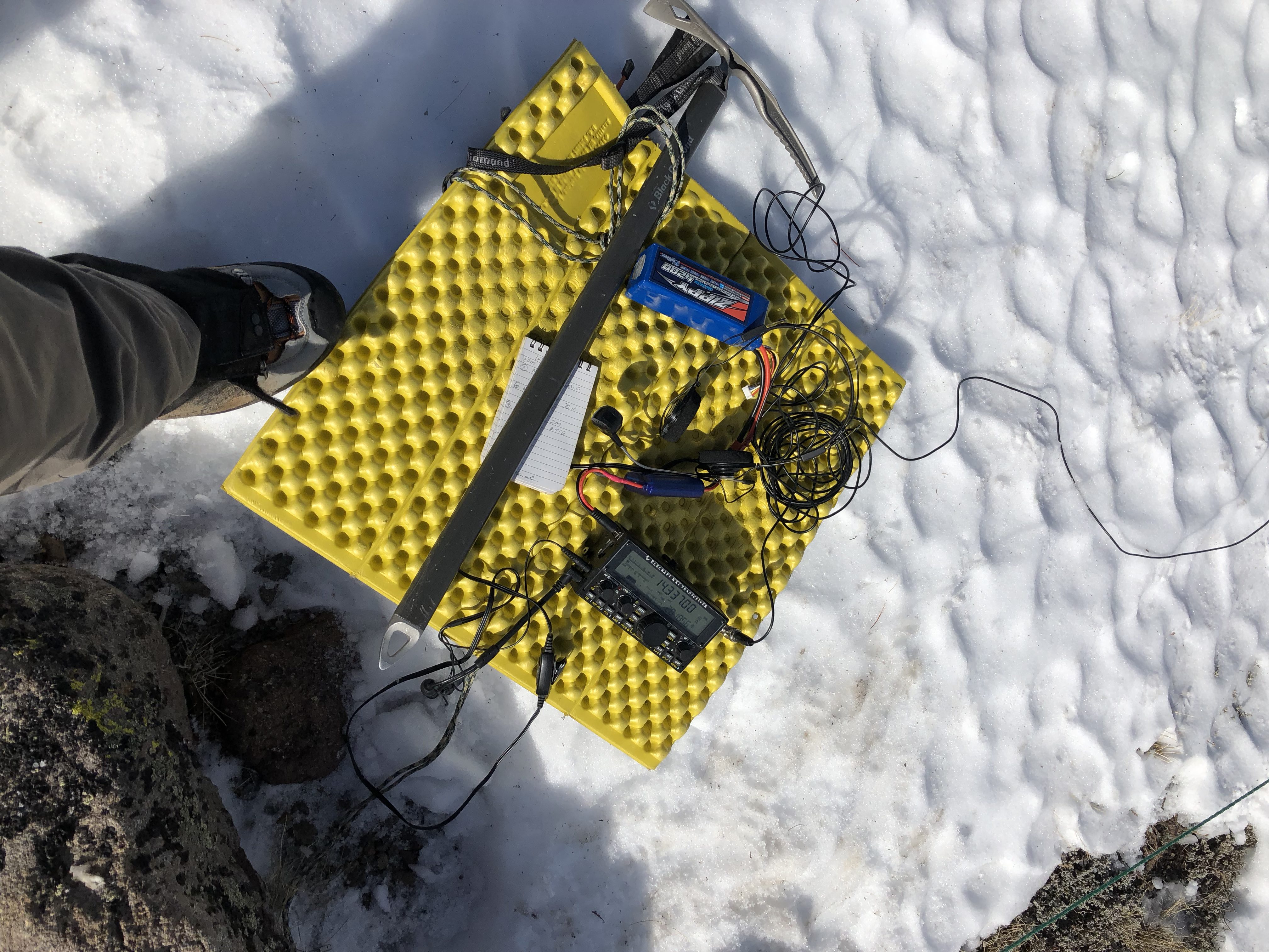 This is what I have been using for a setup of late. Antenna in an inverted vee off of a 15 foot telescoping Crappie Pole. KX2, 4200mAH battery, and well using the sit pad to keep the radio gear off the snow..(found a nice rock to sit on).