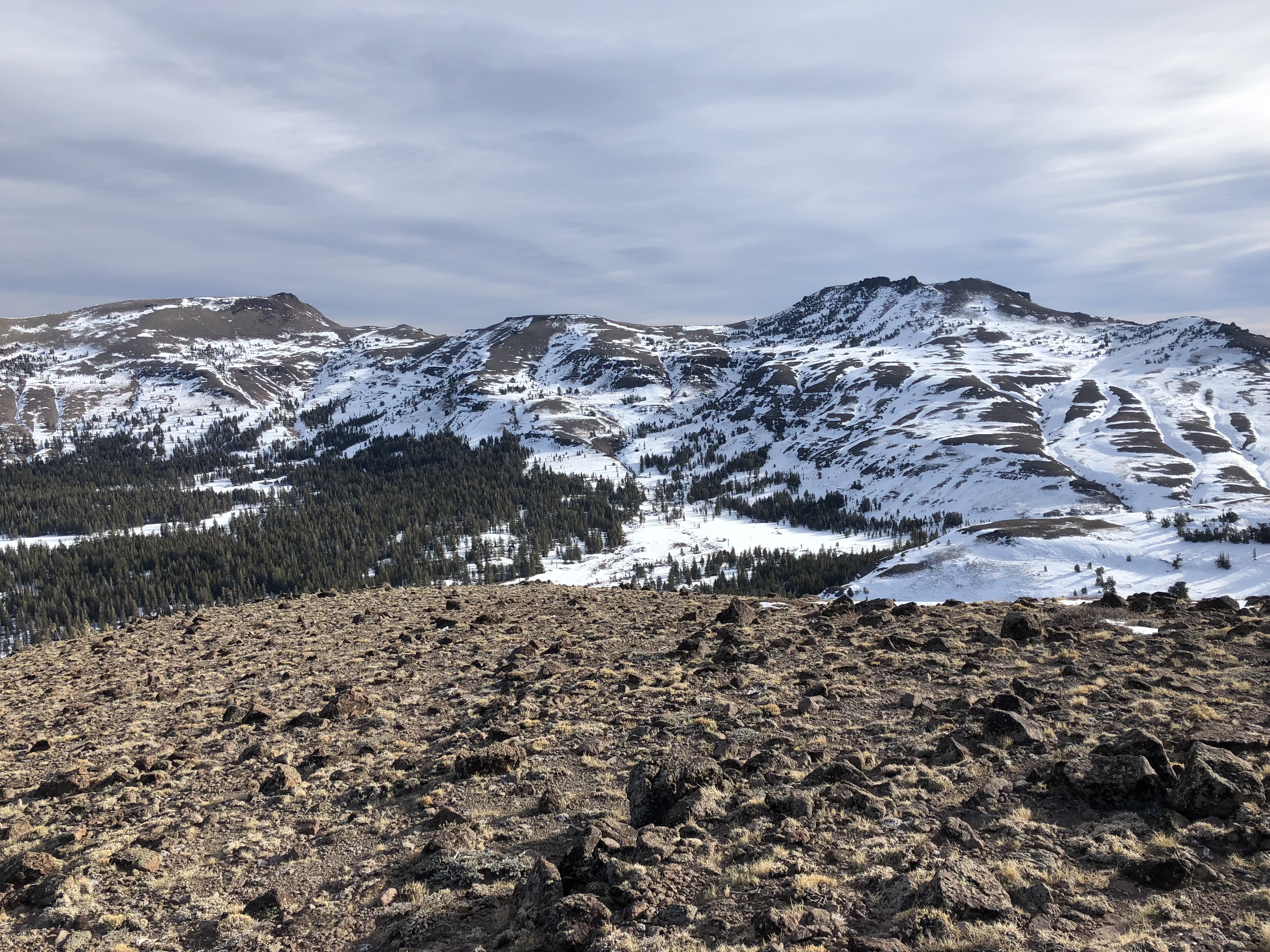 It’s been a pretty low snow year, this is not a peak I would have gone after this time of year normally. I would have waited till Feb/March time frame when there is more snow for snowshoeing and the avalanche danger was LOW. I think it’s pretty obvious from the featured image that the snow was pretty much no consequence this trip. In a nutshell, parked at the lower Carson Pass lot and walked the 1.5 miles of the PCT before it starts to drop down into the Meiss Meadow/Showers Lake area, and just hooked up towards the spine that makes up the Alpine/El Dorado county line. One way is 5.8 miles. If you are doing this between November and May and parking at Carson Pass make sure you have a California Sno-Park pass ($96.00 fine). Also if it is a good snow year parking can be tough because you are competing with a lot more backcountry skiers/snowboarders who like to ride the Red Lake Bowl, or if parking at the upper lot is full. There are some closer options too, or you can always backpack into Showers Lake area, but that will be a pretty tough side trip because you have a lot more elevation to climb to get back to the ridge. So the bulk of the elevation is gained in the first 1.5 miles, and once you reach the first high point/unnamed peak and make the spine the elevation gain/drops are all pretty small. I managed to not need my ice axe even though I carried it thru the day.