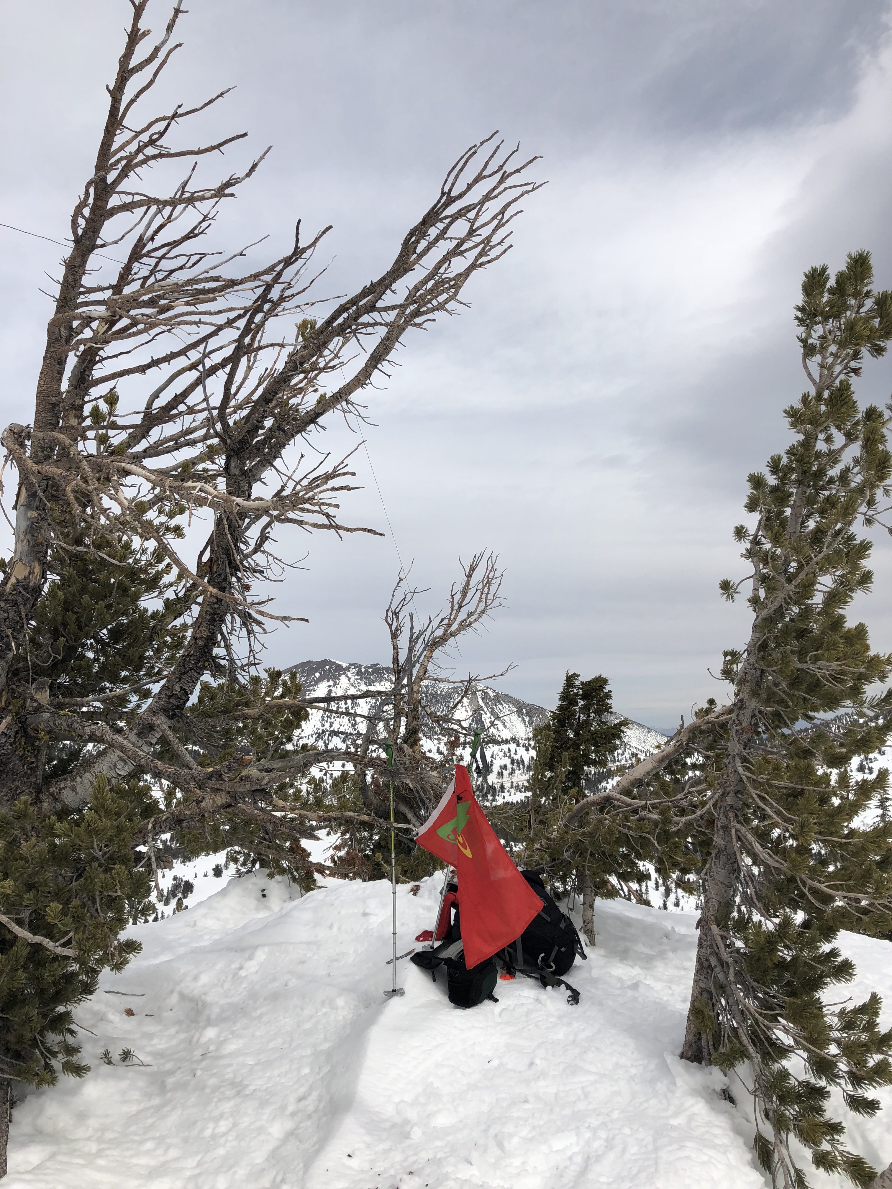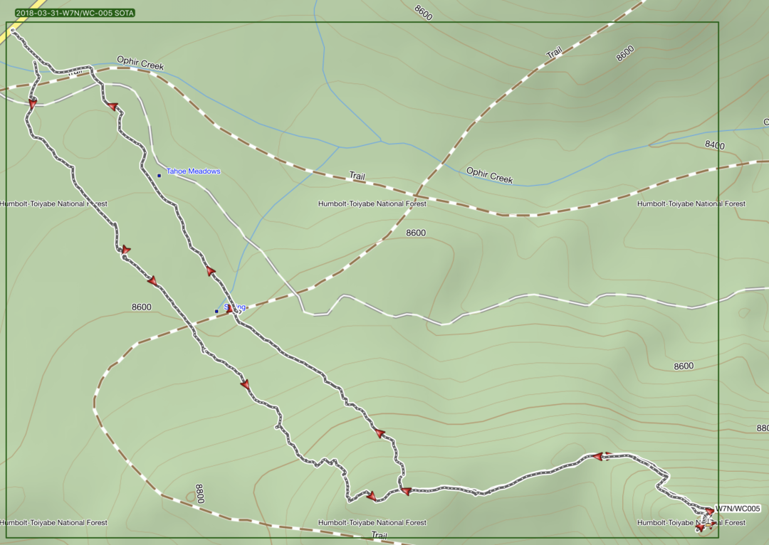 Saturday: Was a productive and beautiful spring weekend in the Tahoe area!    Miracle March has left and the temps are warming, and the difference in one week in the Mount Rose area was very noticeable. If you remember/read, last weekend I did W7N/WC-003 Tamarack Peak in waist deep powder, this weekend I was literally on the other side of Mt Rose highway walking on hard pack easily going 2mph faster…  Looking back at Tamarack on Saturday, what was covered the weekend before was already showing bare.  So Spring is here, and while MM delivered an awesome 12 feet to help our meager snow pack, it’s already melting off.  Before I get into the SOTA side of things, lets rehash this for a second.  At the end of January, we were at a 30% snow pack percentage for the ’17/’18 season.  At the end of the March we were at 85% of our average… Even with the amazing ’16/’17 season we are still not out of the woods, and we could easily slip back into a drought scenario if we keep having these 70-90% snow pack years.  Hopefully we do not accept this as the new norm..   Okay hippy tree hugging climate change PSA is out of the way!!  So on Saturday I decided it was time to finish off the Mt Rose section and consequently have finally finished WC-001 thru WC-005 in the process.  This is an unnamed peak listed as 9225 (W7N/WC-005).  This like Tamarack is one of those i would suggest is easier in the winter then the summer, especially if snowshoeing on hard pack snow..